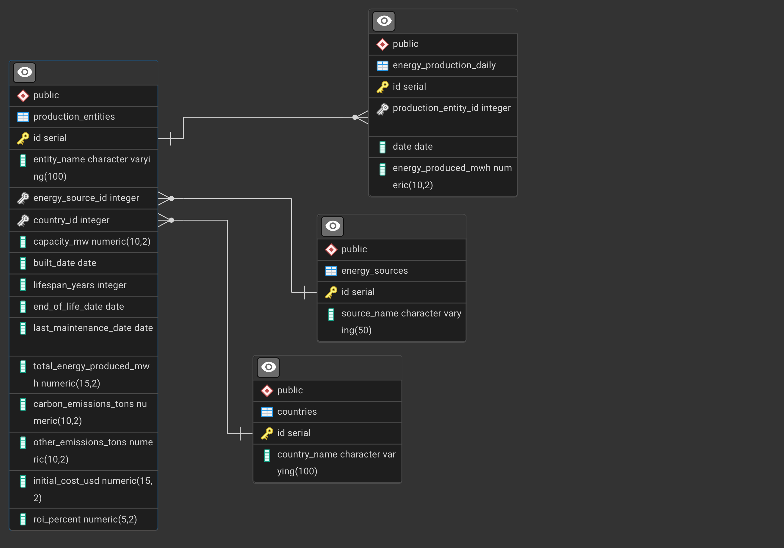 See how the database was created with PL/pgSQL functions: Crearing the Energy Production Database for an explanation.