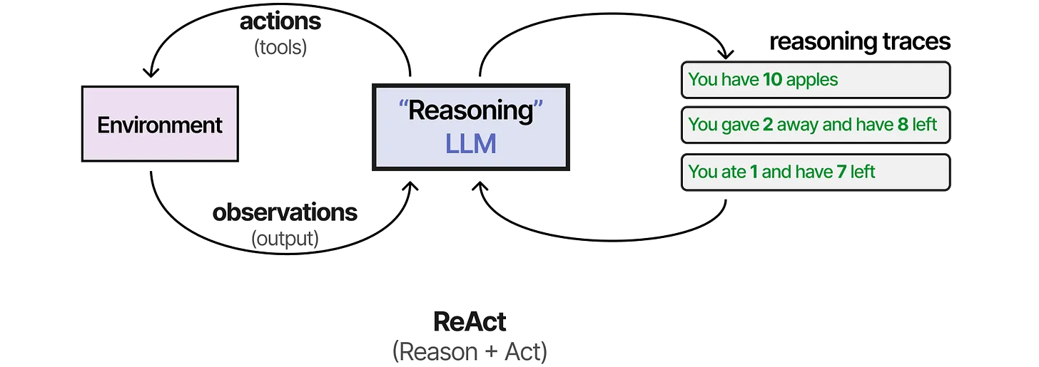 ReAct combines reasoning and acting in a structured cycle for autonomous behavior.