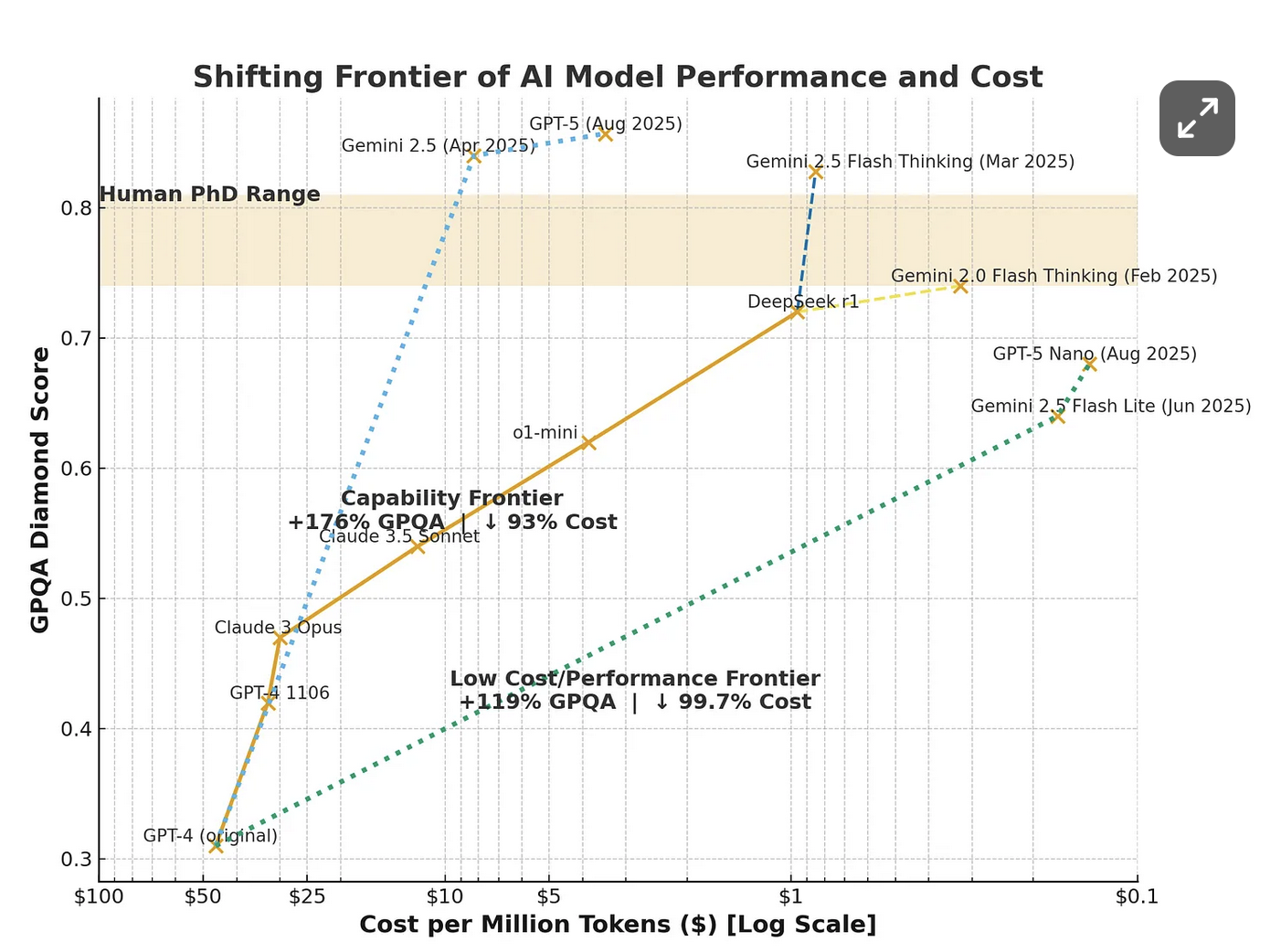 "When GPT-4 came out it was around 50/Mtokens,nowitcostsaround0.14 / Mtokens to use GPT-5 nano. GPT-5 nano is a much more capable model than the original GPT-4."