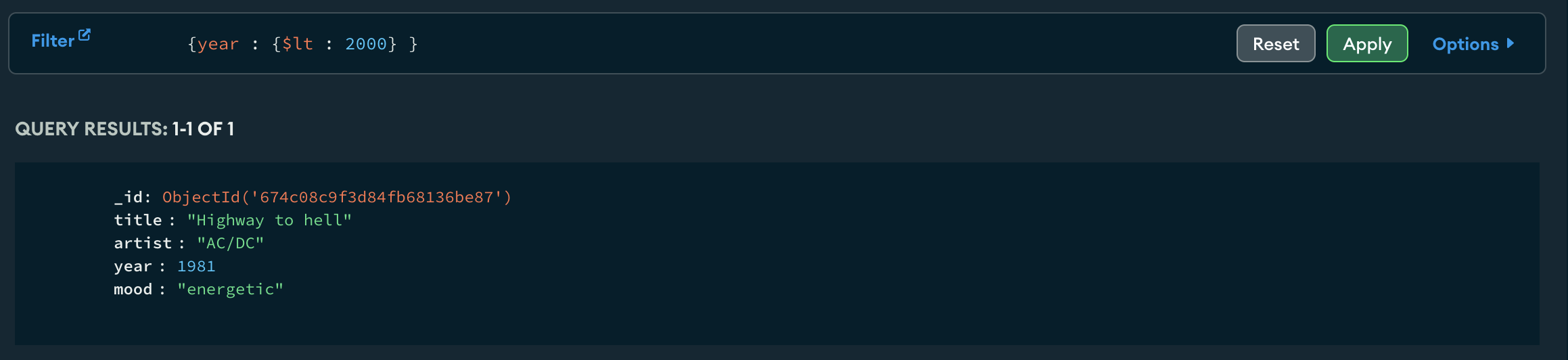 And the query {year : {$lt : 2010}} returns the song that was published before 2010.